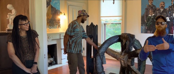 When asked to build work in response to the architecture at Bush House Museum, Cellerini Moore was immediately struck by the house’s elaborate interior design including dense and dark wallpapers, tiled floors, dark wooden furniture and floors, multi-layered molding at the base and top of the walls and ceiling, the gold gilded frames everywhere, and the numerous reflective glass surfaces in the house. Cellerini Moore also learned that when the house was built in the 1870’s, it was ahead of its time technologically speaking, incorporating electricity early on as well as flushing toilets. Cellerini Moore’s clear, minimalist glass and plexiglass structures are intended to heighten the viewer’s awareness of being surrounded by endless patterns and motifs. Cellerini Moore also lets the digital technology, including media players, projectors, tripods, and cords, be visible in the exhibition with the intent to draw parallels between the house’s historic technological advancements and contemporary tech.